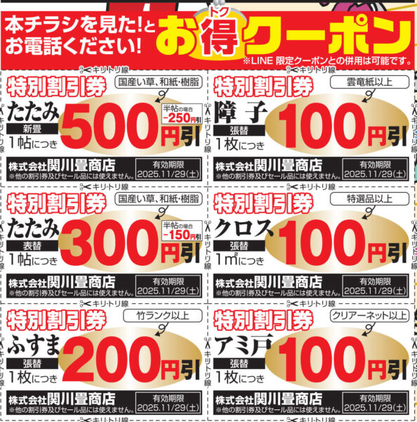 畳・襖・障子の張替えをご検討中の方、今がチャンスです! 期間中はお得なクーポンも配布中! 🔻本投稿画面の提示でもご利用OK!🔻 お得なクーポン、最大500OFF
